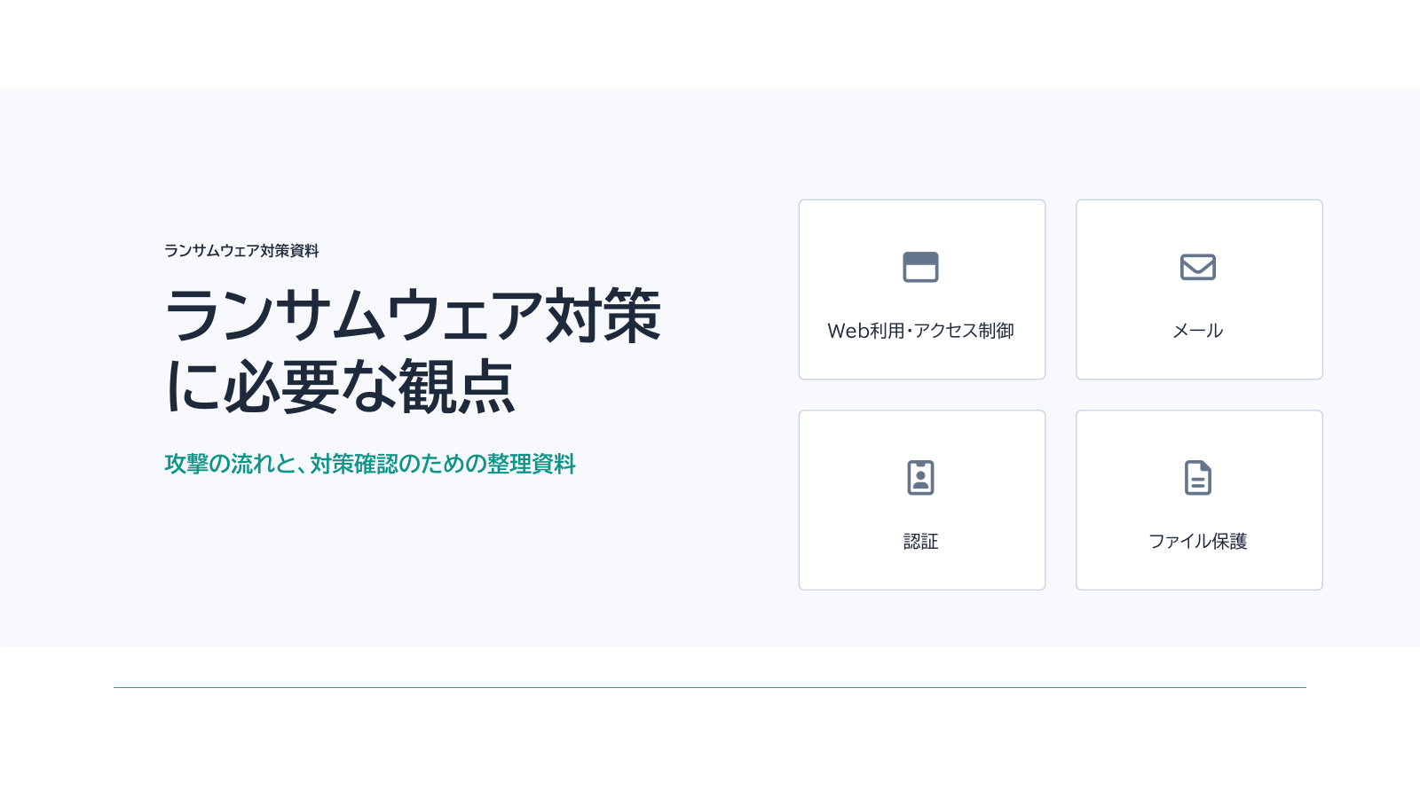 本資料では、ランサムウェア攻撃の流れとあわせて、対策に必要な観点を「Web利用・アクセス制御」「メール」「認証」「ファイル保護」の4つの領域に分けて解説しています。